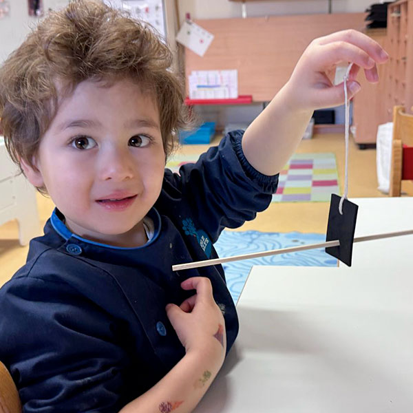 Au début, les enfants ont commencé par réaliser des mobiles simples, en travaillant sur une seule branche pour comprendre les notions d’équilibre et de pivot. Une fois cette première étape maîtrisée, ils se sont attelés à la création de mobiles plus complexes en ajoutant une branche supplémentaire et en confectionnant des formes géométriques en pâte autodurcissante.