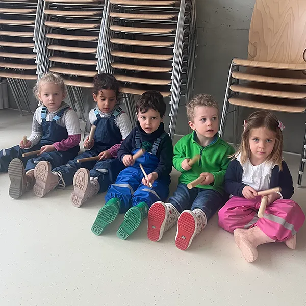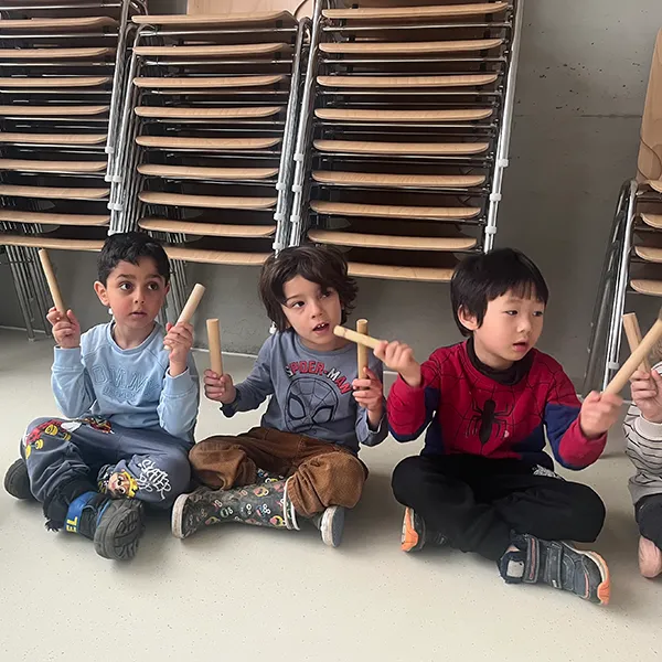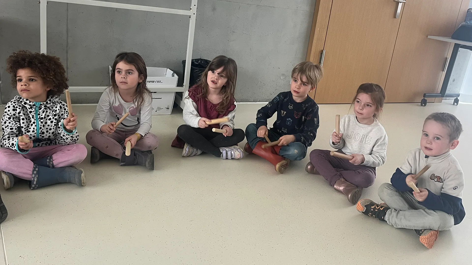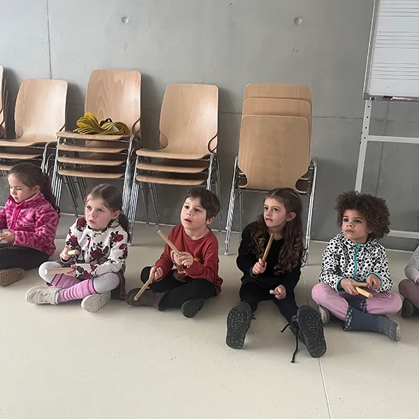 Répartis en groupes, les élèves ont expérimenté le travail du tempo à l’aide de claves. Les enfants de Petite Section marquaient le rythme pendant que les élèves de 1P incarnaient le pas lent ou le galop des chevaux. Les rôles ont ensuite été inversés, favorisant la coopération, l’écoute mutuelle et l’adaptation.