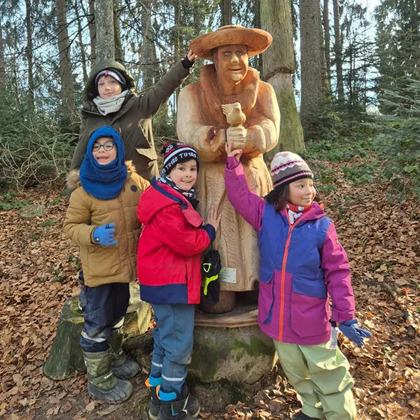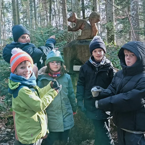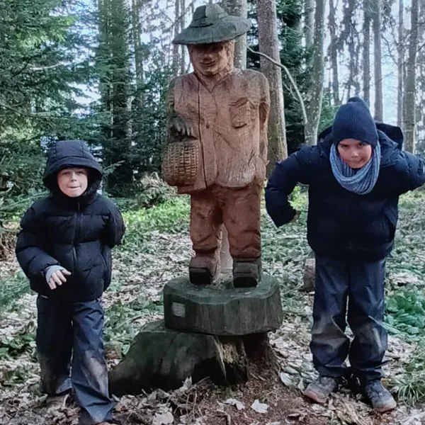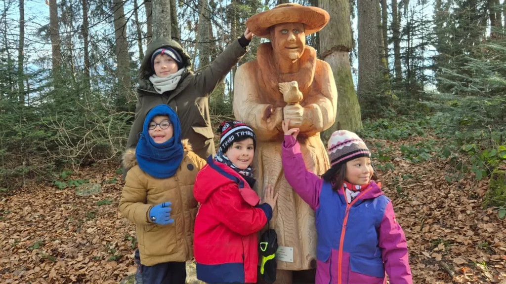 Le mercredi après-midi, place à une sortie au sentier des sculptures de Sorens. Cette balade en forêt a permis aux enfants de prendre l’air, de marcher, d’observer et de rencontrer des œuvres en bois intégrées au paysage naturel.