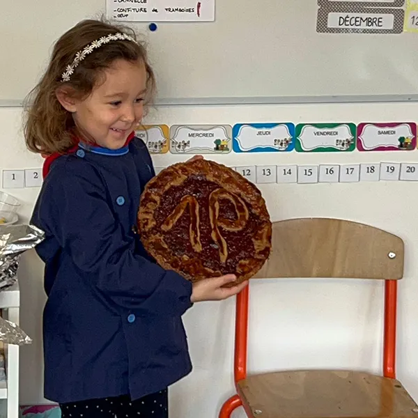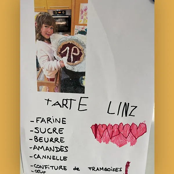 À la maison, Julia a réalisé une Tarte de Linz, dessert traditionnel aux saveurs épicées et au cœur fruité, avec l’aide de ses parents. Pour faire plaisir à ses camarades, elle l’a décorée d’un grand “1P”, en clin d’œil à sa classe.